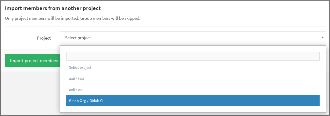 Select the one you want and hit Import project members. A flash message notifying you that the import was successful will appear, and the new members are now in the project's members list. Notice that the permissions that they had on the project you imported from are retained.